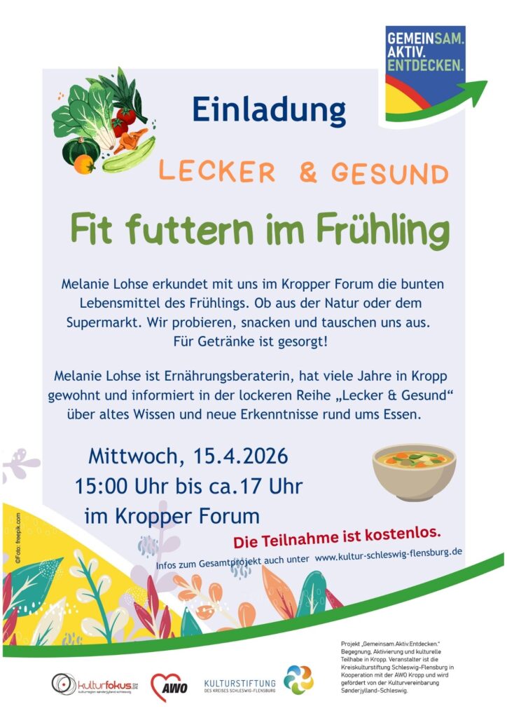 Alles neu macht der Frühling. Am 15. April 2026 um 15 Uhr erkundet Melanie Lohse mit uns im Kropper Forum (Am Markt 11, 24848 Kropp) die bunten Lebensmittel des Frühlings. Ob aus der Natur oder dem Supermarkt. Wir probieren, snacken und tauschen uns aus. Kaffee gibt es natürlich auch!