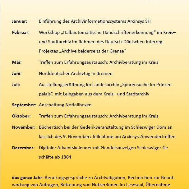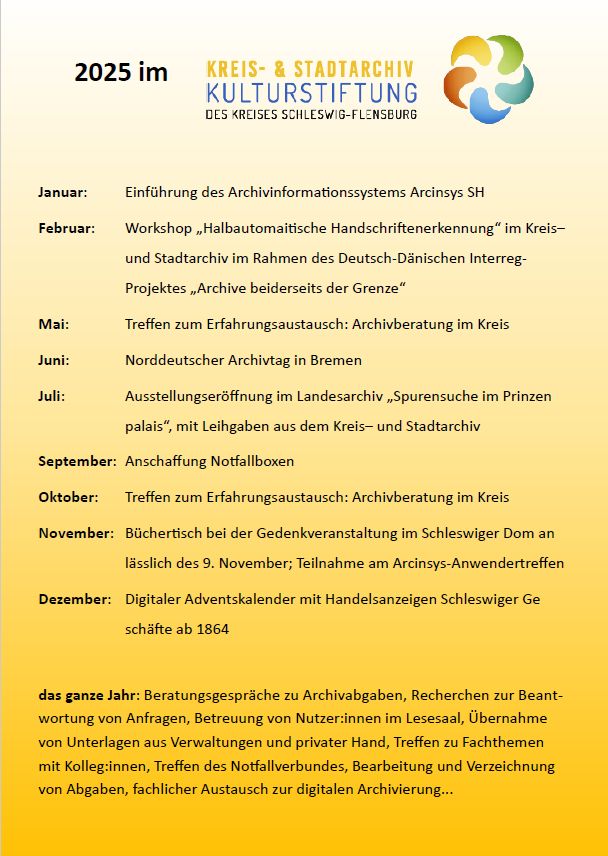 Mit Interreg-Mitteln wurde von November 2024 bis November 2025 ein dänisch-deutsches Archivprojekt durchgeführt, das die Kooperation der Archive beider Länder voranbringen sollte. Netzwerktreffen und fachliche Veranstaltungen fanden großes Interesse. Ein Ergebnis ist eine „Bedienungsanleitung für Familienforscher:innen für Archive in Deutschland und Dänemark: https://archiv.kultur-schleswig-flensburg.de/interreg-projekt/